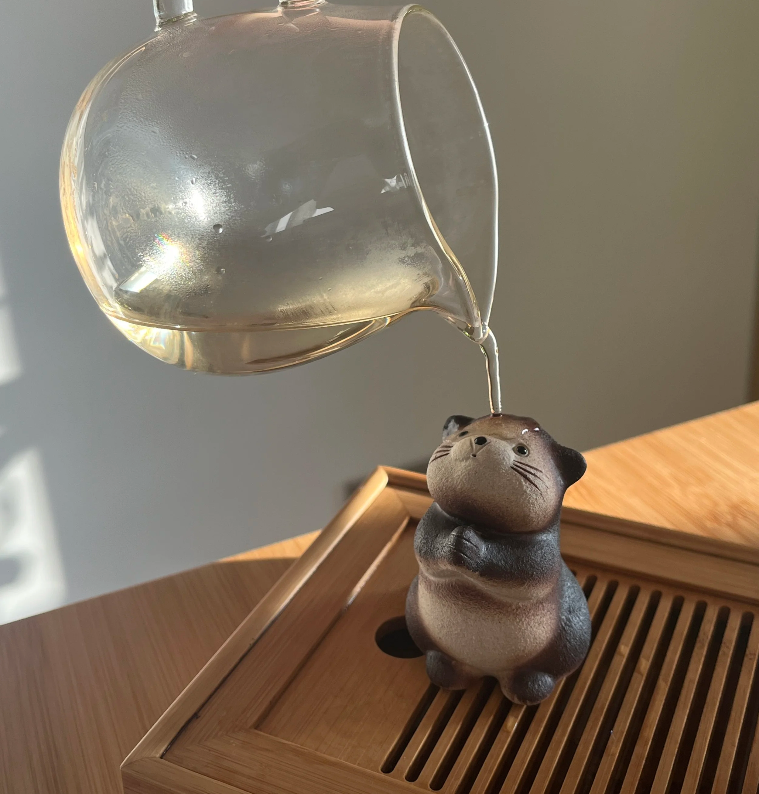 Tea Pets (Teehaustier klingt als deutsche Übersetzung leider echt nicht so schön) sind oft kleine Tonfiguren, die auf dem Teetablett stehen. Sie sind dekorativ und bestehen oft aus unglasiertem Ton. Bei der Gong Fu Cha Teezubereitung werden die Teeblätter durch den ersten Aufguss aktiviert und gewaschen. Dieser Vorgang spült feinen Teestaub und Verunreinigungen weg und auch die Bitterstoffe und Adstringenz lösen sich oft im ersten Aufguss. Der Tee wird mit dem nächsten Aufguss weicher und entfaltet sein Potential. Diesen ersten Aufguss, der sowieso nicht getrunken wird, gießt man über das Tea Pet. Durch die poröse Struktur des Tea Pet Tons, können sich mit der Zeit Aromen und Farbe vom Tee festsetzen.