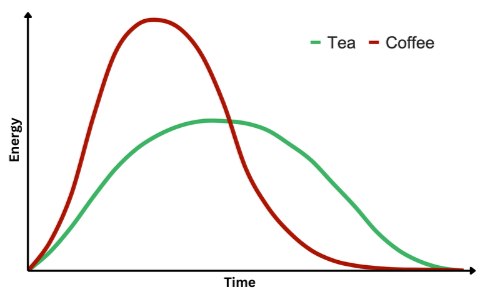 Vereinfachter Verlauf der empfundenen Koffeinwirkung von Kaffee und Tee